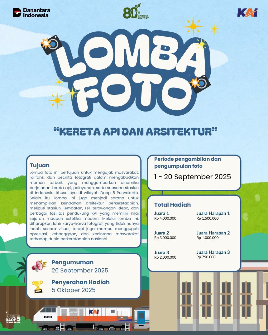 MARKNEWS.ID , YOGYAKARTA – Dalam rangka memperingati HUT ke-80 PT Kereta Api Indonesia (Persero), Daerah Operasi (Daop) 5 Purwokerto menggelar lomba foto bertema “Kereta Api dan Arsitektur”. Kegiatan ini berlangsung mulai 1 hingga 20 September 2025 dan ditujukan bagi masyarakat yang berdomisili di wilayah kerja Daop 5 Purwokerto.