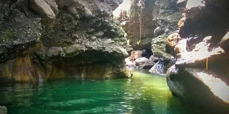 Tebing batu yang mengapit aliran sungai menghadirkan pemandangan mirip Green Canyon di Jawa Barat. Dari luar terlihat sempit, namun saat masuk, wisatawan akan menemukan area air yang cukup luas dengan nuansa menenangkan. -