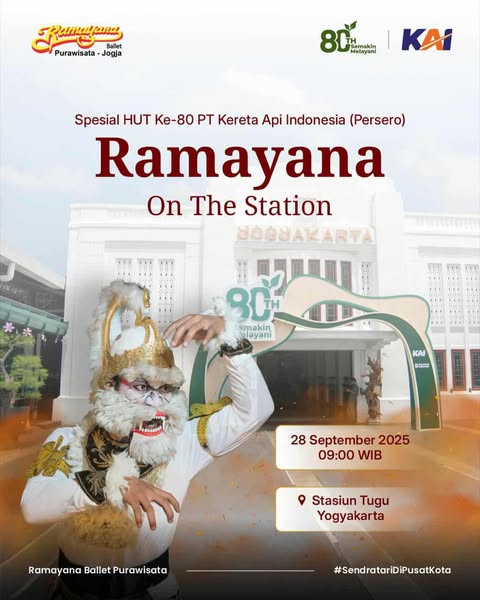 Marknewsid , Yogyakarta – PT Kereta Api Indonesia (Persero) Daerah Operasi 6 Yogyakarta menyiapkan kejutan spesial dalam rangka memperingati Hari Ulang Tahun ke-80 perusahaan. Bersama Ramayana Ballet Purawisata, KAI akan menghadirkan pertunjukan seni budaya bertajuk “Ramayana On The Station” yang digelar di Stasiun Tugu Yogyakarta, Minggu (28/9/2025) pukul 09.00 WIB.